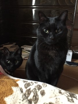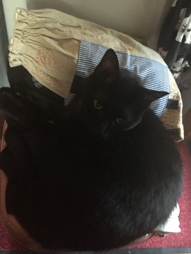 黒猫、去勢済、マイクロチップ済、長いしっぽ、大きめの耳、人を選んで近寄ります。首輪無し。