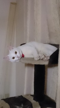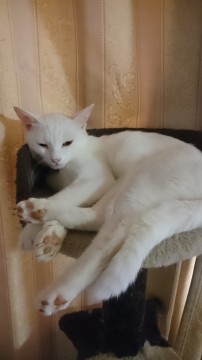 全身真っ白で肉球は全て、薄いピンク色をしています。