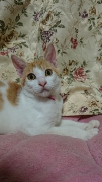 ヘアゴムのピンクの首輪つけていました。