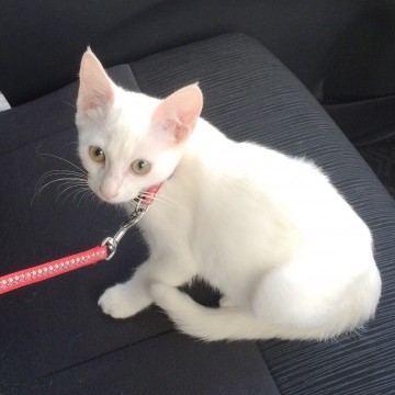 真っ白ですが頭の左側に黒い毛が数本生えています。しっぽの付け根あたりは少しクリームっぽいです。