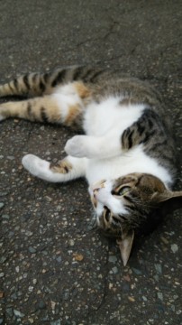 お腹と前足が白く、背中がキジトラ柄です。尻尾が丸まってウサギのように見えます。