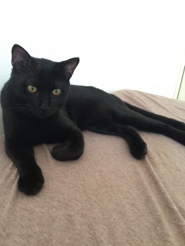 黒猫。黒にゴールドの金具がついた首輪をしています。