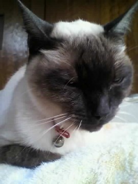 シャム猫ですがトラと混じっているらしく、丸顔で耳・顔は真っ黒