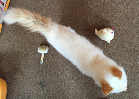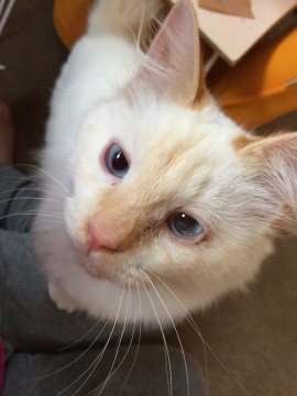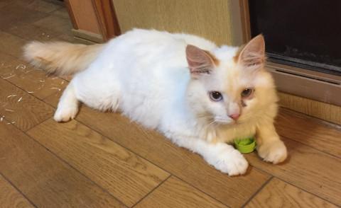 やや長毛、体の色は白く耳と尻尾はオレンジ色、目の色は青
