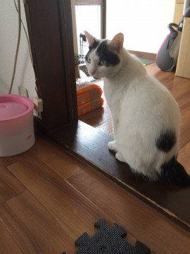 体は白で頭は黒の八割れ、背中に黒のブチ、尻尾はほとんどなく黒の丸っぽい形です。