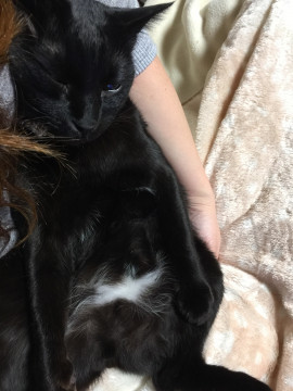 見えにくいけど金色の首輪と、鈴が付いています。お腹の下の方に白い毛が生えてます。