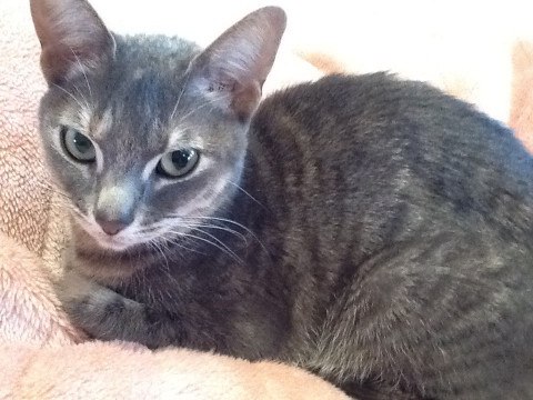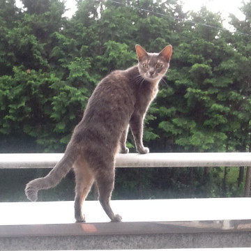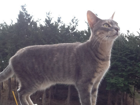 アビシニアンとのミックスです。脚が長くスマートな体型です。黄色の首輪をつけています。とても臆病な猫です。