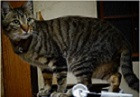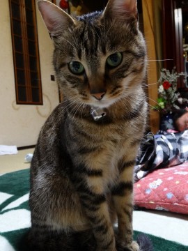 色は薄めのキジ虎(茶色地に黒い虎模様)で、肉球は黒です。体格は太っても痩せてもいない平均的な大きさです。もし外れていなければ金属製のハート型の模様の入った赤い首輪をしています。それと、赤いリードが付いているかもしれません。鳴き声は高めで好奇心旺盛ですが臆病なところがあります。