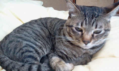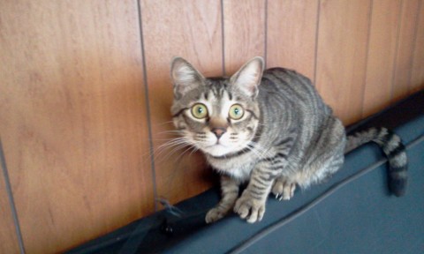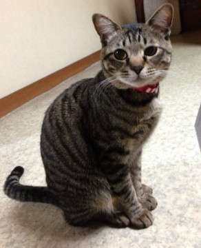 キジトラ、去勢済み、鈴付きの赤白ストライプの首輪を付けています。