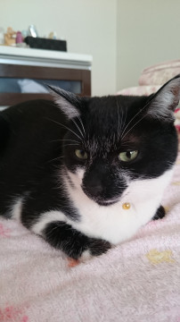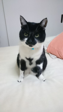 色は白黒の黒が多め、足先は白でごま塩のように黒の点々があります。2つ折れのカギしっぽ、目が少し薄グリーンぽく、体重は5.5キロあり少し大きいです。首輪は水色にイチゴの絵、鈴が付いています。