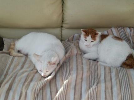 オス猫(去勢済み)、体全体は白でしっぽと耳元が茶トラ柄です。体重が6~7キロで大きく、左耳の先端が丸く欠損しています。とても人懐こく呼ぶと寄ってきます。青っぽい首輪をしています。