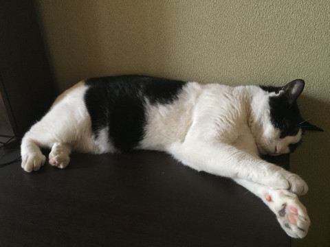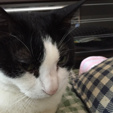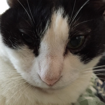 白黒で尻尾が短く鍵っぽく曲がっています。首輪なし、去勢ずみです。