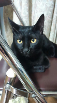 黒猫、年の割りに太りぎみ、右頬に一本だけ短い白ヒゲ、尻尾は長い、食い意地が張ってる、去勢なし、首輪なし。写真よりも太ってます。