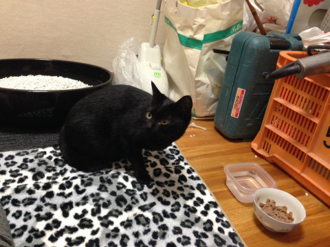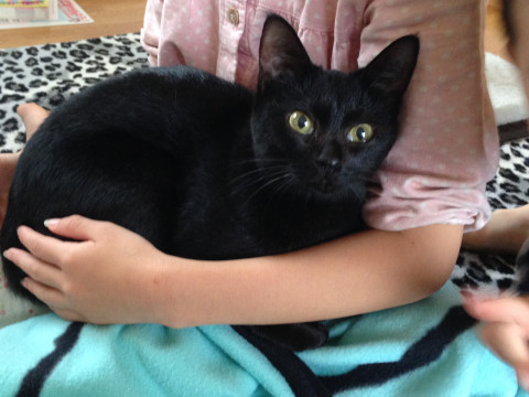 黒猫で、お腹に白い毛があります。