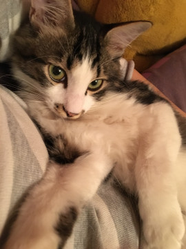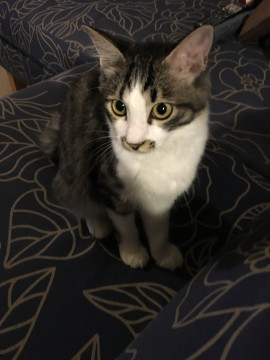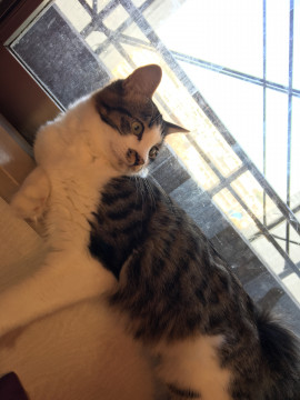 サバ白で長毛です。首の部分は真っ白です。鼻と鼻周りが茶色。