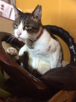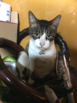 白と黒のキジシロのオスで人懐こい成猫です。