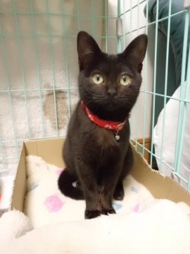 茶色がかった黒猫で赤いゴムの首輪をしています。