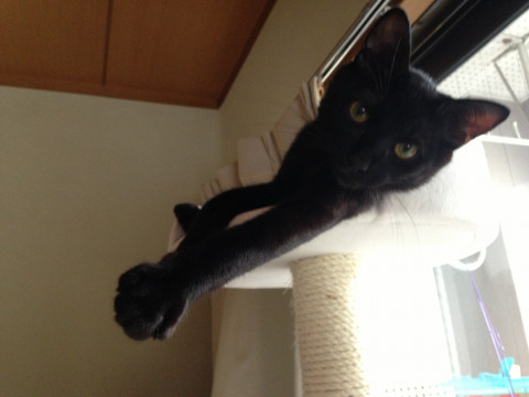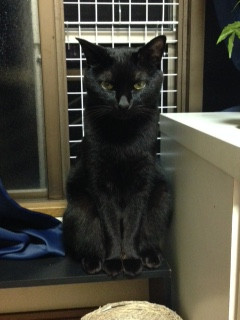 特徴:オス、黒猫、雑種、体系は長め(4.5キロ)、3歳、尻尾が3センチほどで短い、首輪なし、去勢済み