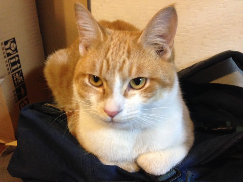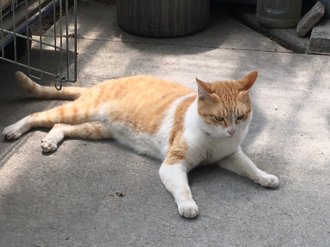 鼻筋に白いすじが一本有ります。赤い鈴付きの首輪をしてます。去勢しています。