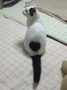 白多め白黒猫で、片耳・尻尾が黒です。背中の黒ブチと眉毛のような模様が特徴です。成猫ですが身体や手足小さめです。耳カット済、首輪無しです。警戒心は強めですが、人慣れはしており、ご飯をくれるは人にはスリスリします。抱っこが嫌いなので捕まえようとすると逃げてしまいます。