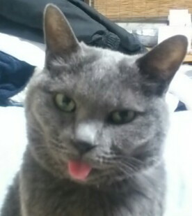 ロシアンブルーのような紫の毛並みで長尾。ピンクの首輪をしています。