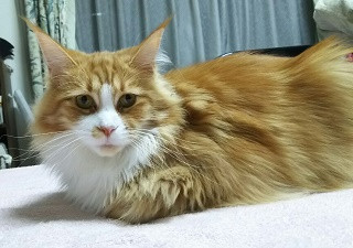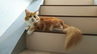 背中が茶色、腹・手足・顔が白で長毛、しっぽがとても長くふさふさです。