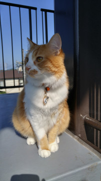 足は白くて、迷子首輪と猫の御守りがしてあります