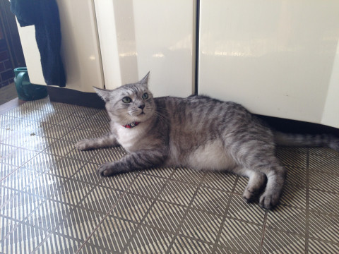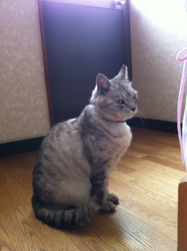 アメショーのようなグレイ模様ですが、雑種です。尻尾は鍵尻尾です。
