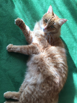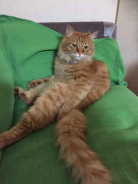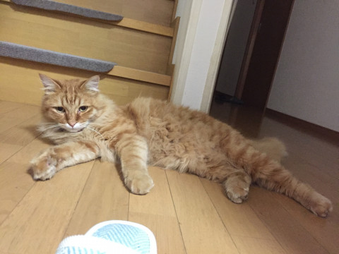 とにかく体格のいい長毛の茶トラです。背中は模様のない茶色です。しっぽは長く太くふさふさです。人見知りでこわがりです。