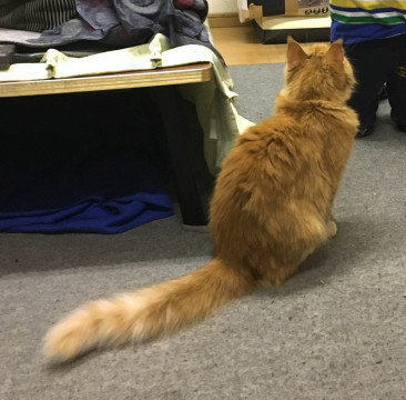 オレンジ色に近いトラジマ、鼻先、胸、腹、脚は白。毛が長めでシッポがフッサフサ。鼻はピンク、目は緑がかった金。犬みたいに人懐こくて賢い子です。