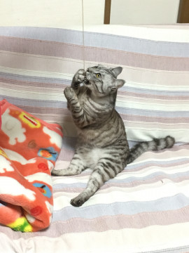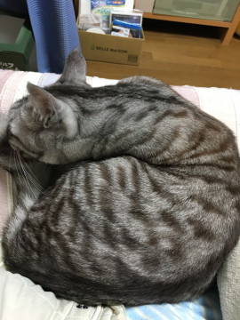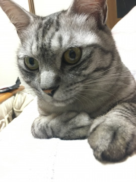 グレーとこげ茶色がミックスされたような色のサバトラです。