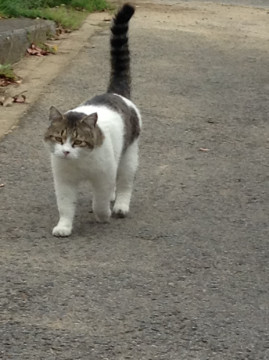 顔は黒茶トラですが、身体は白い毛が多いです。