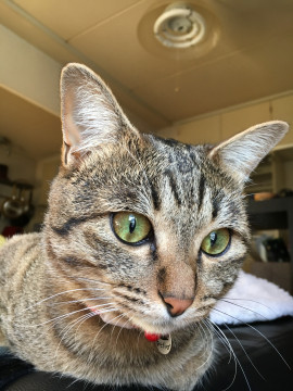外れていなければ、鈴付きの赤い首輪を付けています。(電話番号記載)