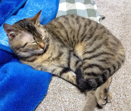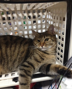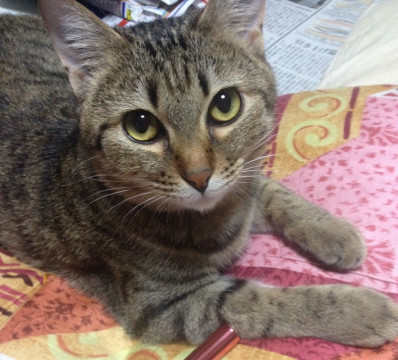 明るめのキジトラ、首輪なし、不妊手術済、しっぽ長くてまっすぐ、 目は黄色でぱっちり、口もとは白い、体重4.5キロ