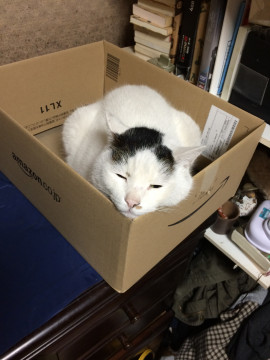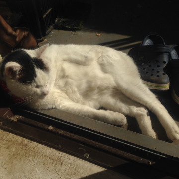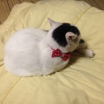白地に頭に黒い模様、尻尾がキジトラ風の縞模様です。赤いリボン?と鈴の付いた首輪を付けています。