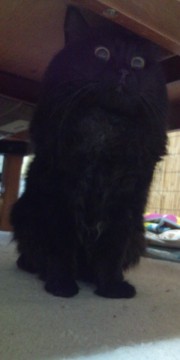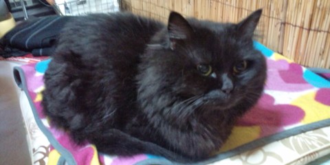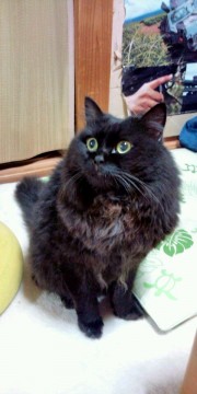 まっ黒で少し長めの毛です。普段はすごくおしゃべりで名前を呼ぶと必ず返事をします。背中にハゲが1つあります。しゃべる猫しおちゃんにそっくりです。