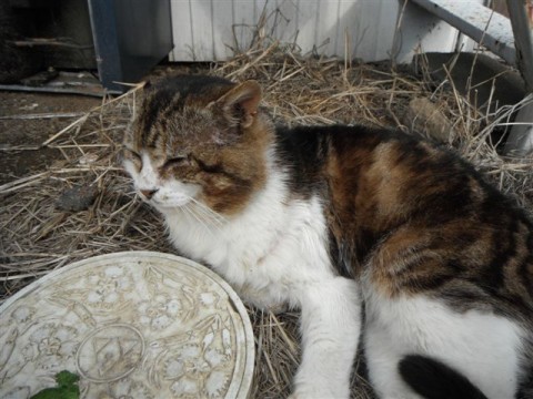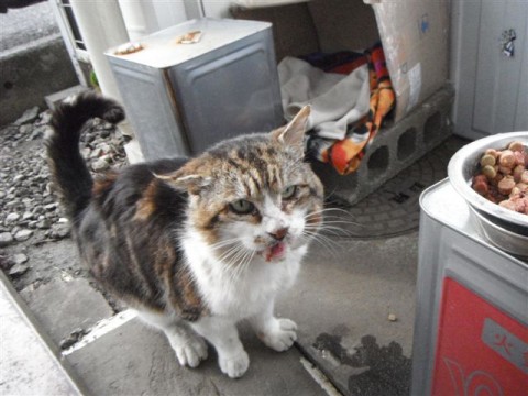 黒・茶・白の三毛。左目は病気でめやにが多い。右耳の下の毛が禿げている。前足びっこで歩く。歩くのは遅い。人なつこい。