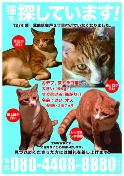 完全室内飼いをしていましたが、自宅から脱走しました。1歳半頃まで野良猫をしていたので、猫の溜まり場等にいるかもしれません。似た猫がいましたら、何卒ご連絡お願い致します。