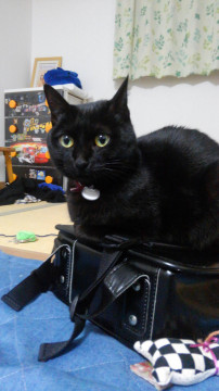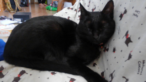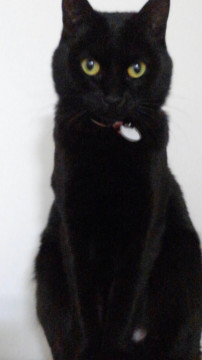 とにかく真っ黒で赤い首輪をしてます。体重約5キロ。