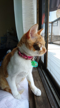 右目に黒ぶち、チャトラ、緑の首輪、マイクロチップのIDがついてる、名前、TELが首輪についてます。