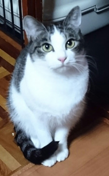 お腹は白い、向かって左鼻の横が薄茶。背中に白い斑点があります。
