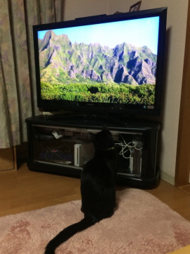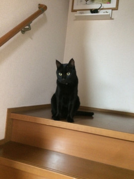 雑種。体重は約5kg。真っ黒で太めの長いシッポ。目の色は黄色で黒目の周りがうっすら緑。去勢済み。黄色の首輪。とてもビビりです。