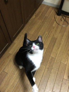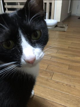 白と黒のハチワレ柄。左右対称のハチワレではなく、若干バランスの悪いハチワレ柄です。