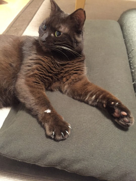 短毛のこげ茶色で右前足に白い小さなブチがあります。