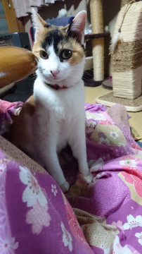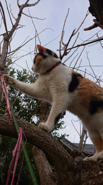 三毛猫です。赤い首輪してますが、迷子札はないです。臆病で知らない人だと逃げてしまいます。