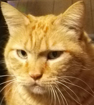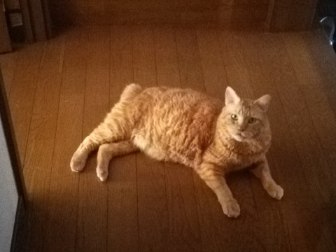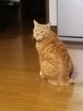茶トラ、丸くて短いしっぽ、大きい体型、お腹太め