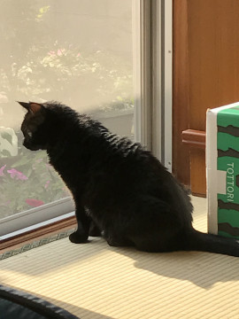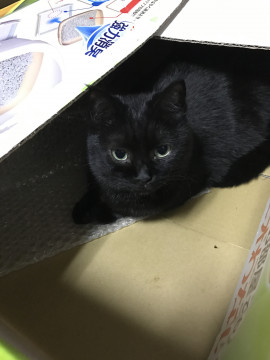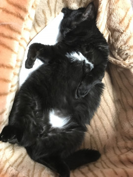 ◎黒猫で、胸とお腹に白い三日月のような模様。