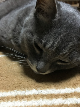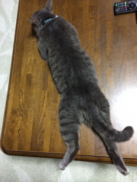 ロシアンブルーのグレーにしま模様。首輪はしていませんが以前装着のあとがあります。去勢済みです。