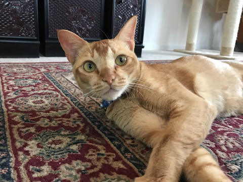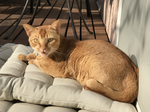 青い首輪をしています。名札と迷子札、2枚付いていて、私の携帯番号がかいてあります。