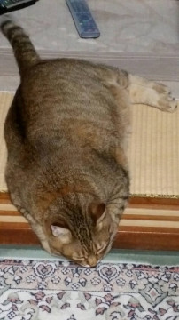 雑種の焦げ茶色のとにかくデブの猫です
